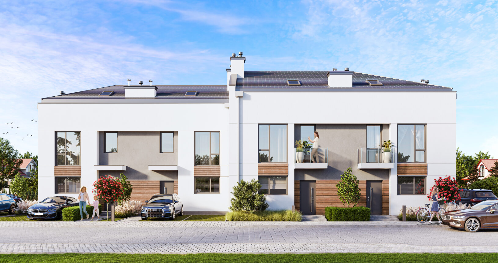 Prosty, ponadczasowy design, duże przeszklenia, prywatne ogródki i funkcjonalne wnętrza – to przestrzeń, w której chce się żyć.